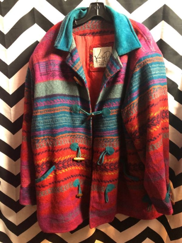 HEAVY 1980’S AZTEC PRINT COAT SUEDE COLLAR & TOGGLES