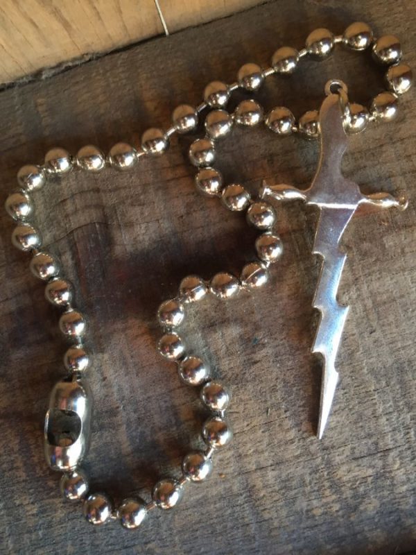 Confection Jewels necklace, choker style, large dagger/lighting bolt pendant, heavy ball chain, silver