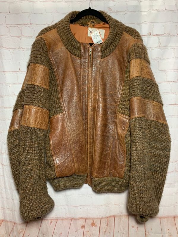 HEAVY chunky KNIT LEATHER PATCHWORK JACKET as-is *Tear in collar