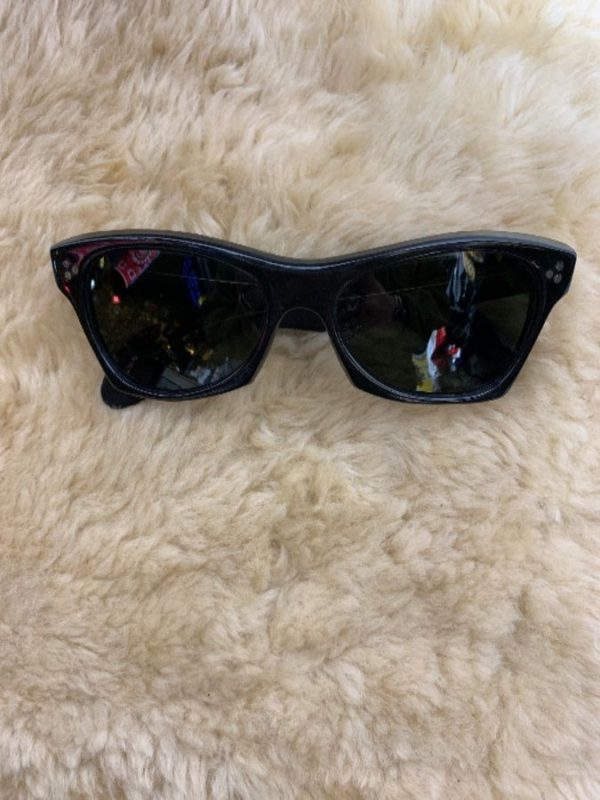 1950’s sunglasses, mod heavy frame with flat bottom rims & wide temple pieces, cool colored lenses, black/gray