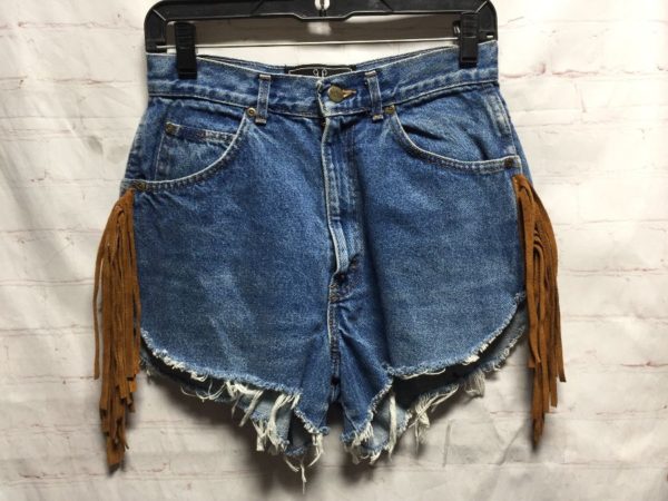 HIGH WAIST DENIM CUT-OFF SHORTS W/ LEATHER SUEDE FRINGE DOWN SIDES