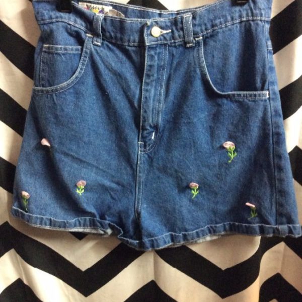 ZING DENIM SHORTS – HIGH WAISTED – EMBROIDERED FLOWERS ON LEGS