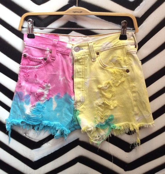 Vintage reworked Levis Shorts, that have been frayed, and tie dyed a rainbow of colors, multi-colored small fit