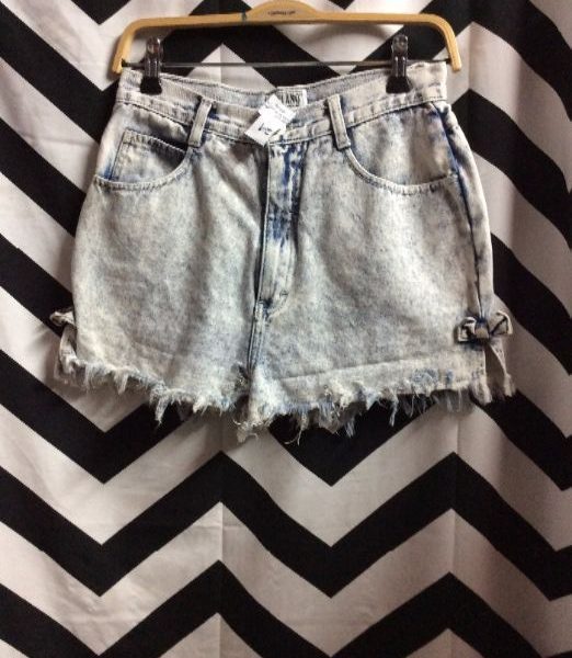 Denim shorts, cutoff, Steffano, high waisted, bows on both sides of bottom, acid wash, pale blue, size 29W