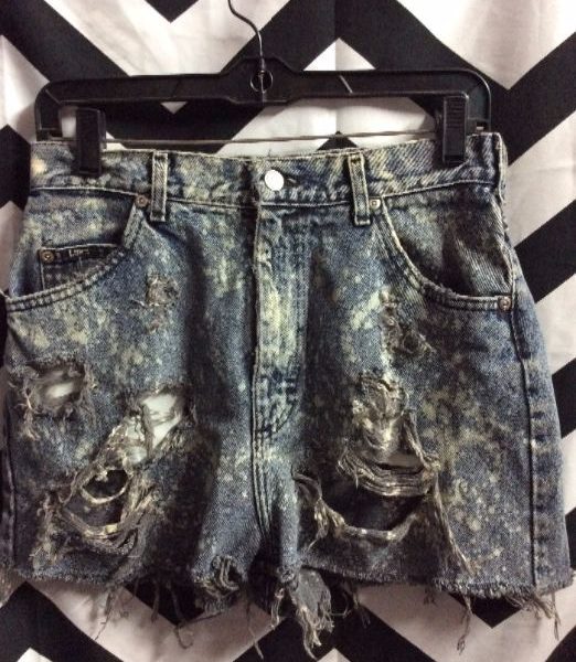 LEE DENIM SHORTS – HIGH WAISTED – ACID WASH – RIPS – BLEACH SPLATTER