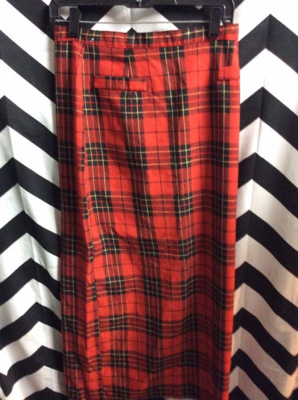 Pencil skirt, midi length, high waist, plaid print, red/black/yellow, size S
