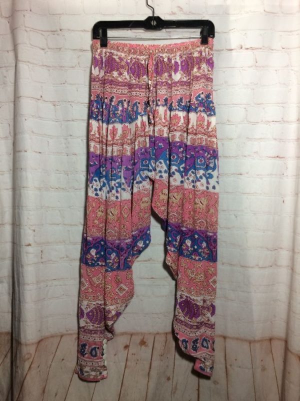 Beach pants, elastic waist, drawstring, Hippy style print, elephant & fish in vertical design, pink/white/purple, size M