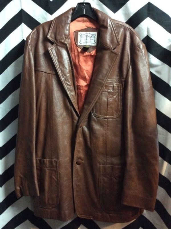 Hoffman blazer jacket, leather, button-up, front pockets, lined, brown, size 46