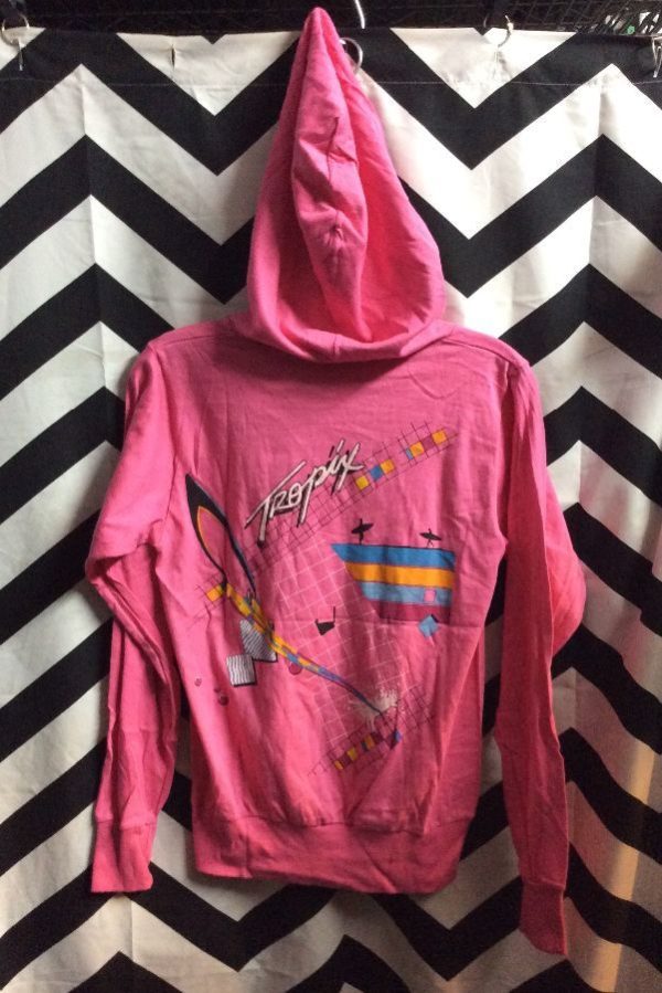 T-shirt, pullover, long sleeve, hooded, 1980’s Surfer back design, deadstock, hot pink/multi
