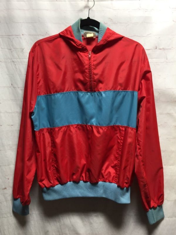 Blue Star windbreaker jacket, pullover, 1/4 zip-up, hooded, ribbed cuffs/collar/hem, horizontal stripe across front chest, color-block design, red/blue, size M