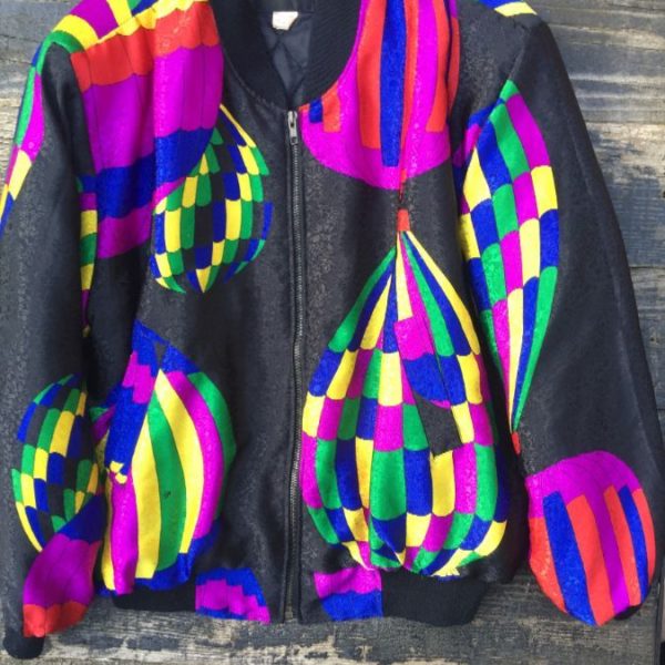Windbreaker jacket, zip-up, thick, Hot Air Balloon design, Marti Gras color-way, black/yellow/green/red/purple, size L
