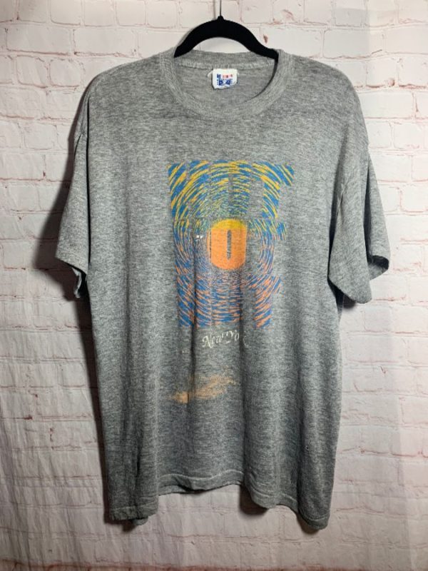 Americas Finest T-shirt, New York, Hot Hot Hot, screen printed large O surrounded by tiger striped circle w/cut outs to form letters in a full front design, made in USA, orange/blue/white, size XL As is