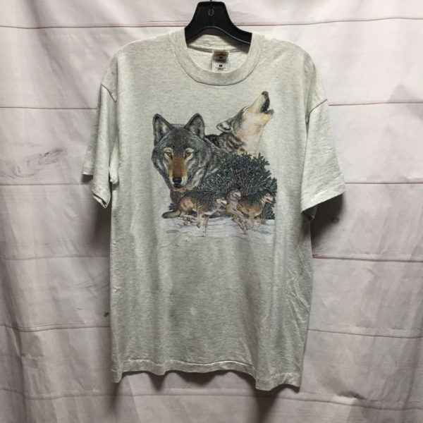 FRUIT OF THE LOOM T-SHIRT, 50/50 COTTON/POLYESTER, CREW-NECK, HOWLING WOLF PACK, SCREEN PRINTED FRONT WOLF GRAPHIC, LIGHT GRAY/BLACK/BROWN, SIZE L