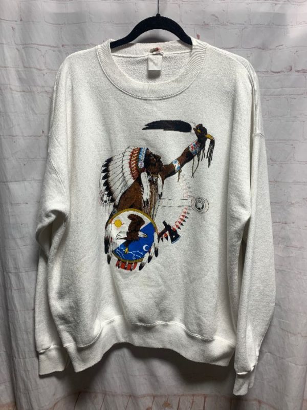 Wilson sweatshirt, pullover, Indian warrior in war bonnet with eagle shield/tomahawk/feather design, screen printed full front design, white/brown/red/blue/yellow/black, size L