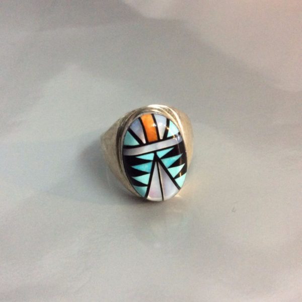 RING – TURQUOISE/ONYX/CORAL/MOP INLAY DESIGN – STERLING SILVER SETTING – SIGNED S.B.