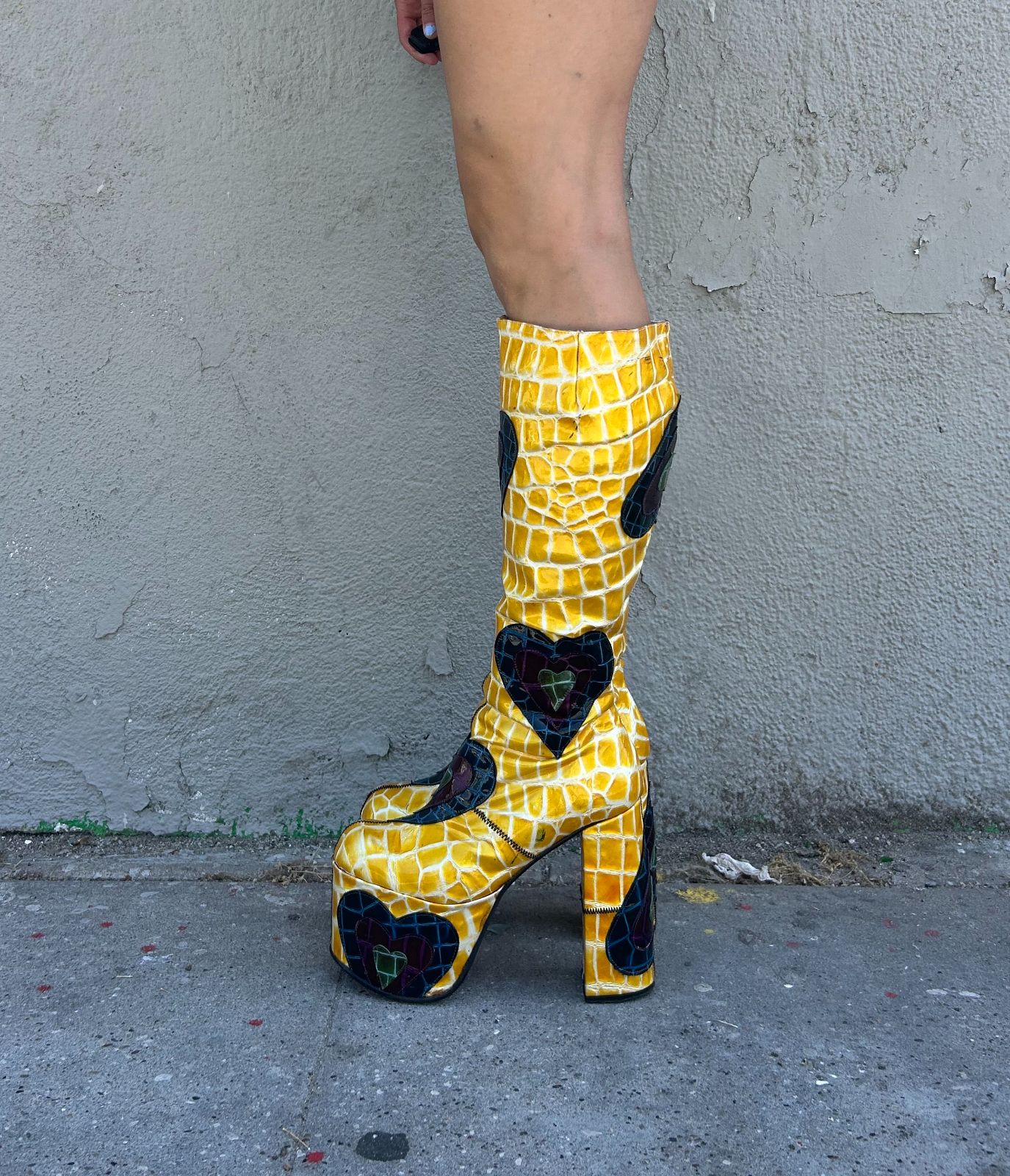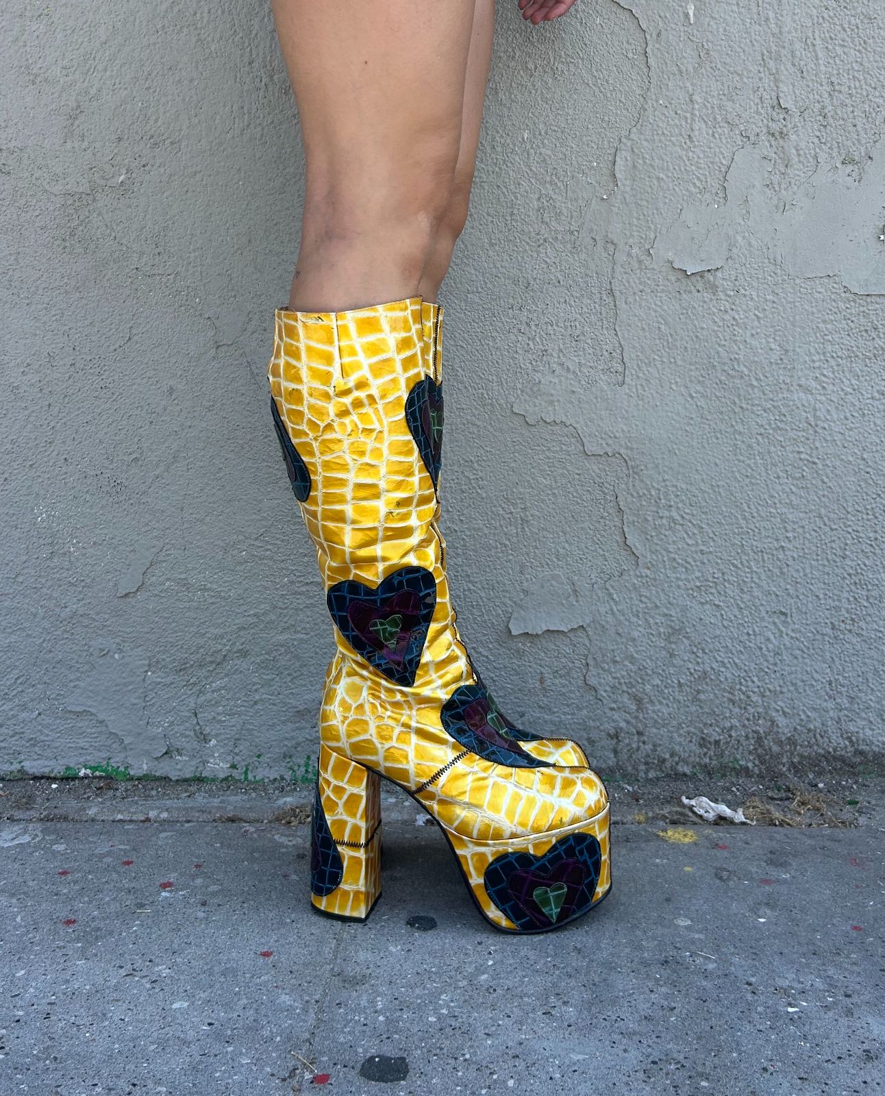 INSANE! 1990S | EARLY Y2K MADE IN SPAIN! CROC PATENT LEATHER KNEE HIGH PLATFORM BOOTS HEART PATCHWORK APPLIQUES