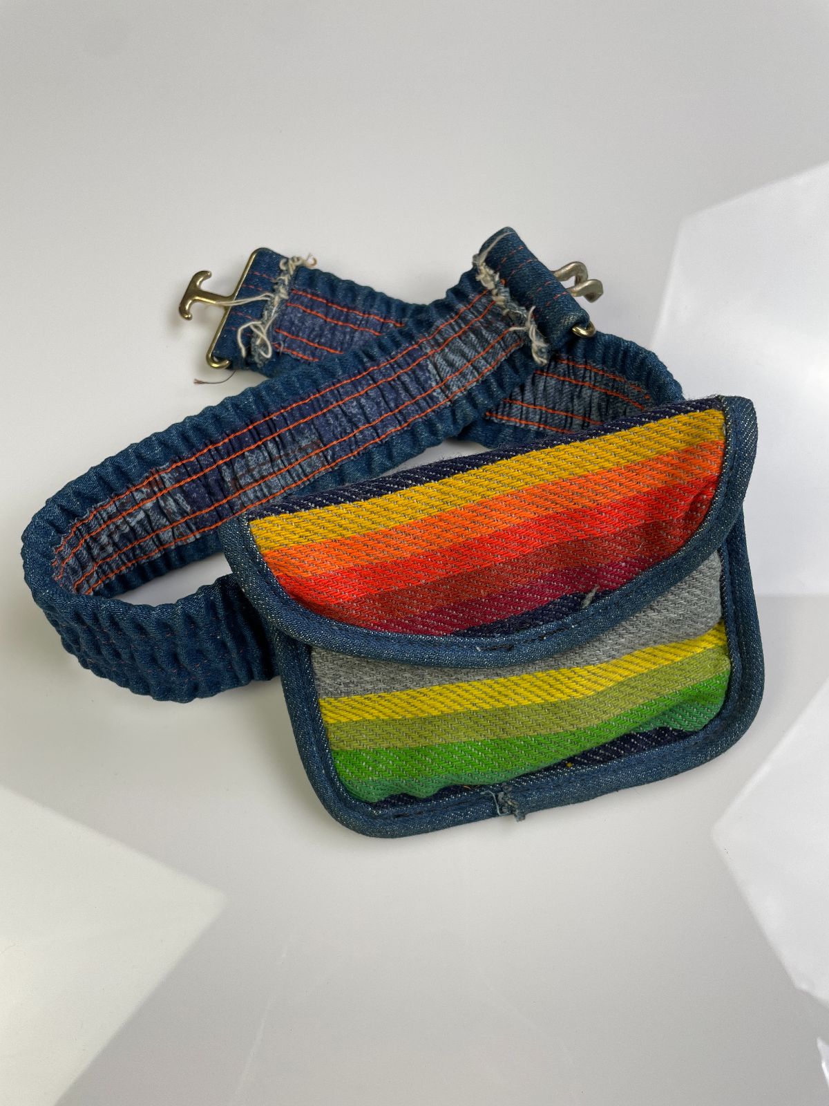 INSANELY AMAZING & RARE!! 1970S DENIM & RAINBOW TEXTILE STRETCH BELT BAG