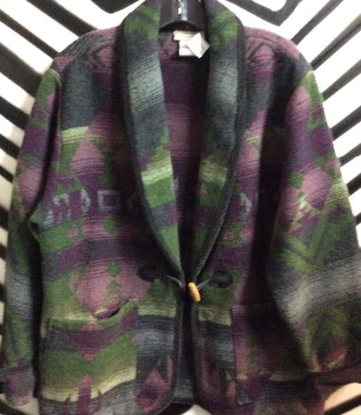 Jacket, green/purple/black Aztec design, size S