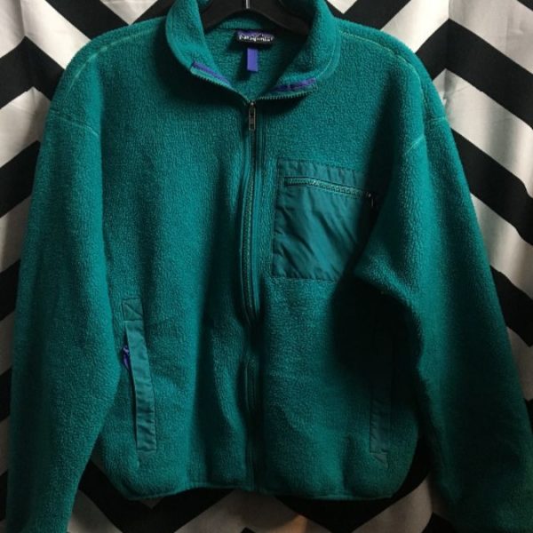 Patagonia fleece jacket, zip-up, 3 front zippered pockets, collar, teal/purple, size S