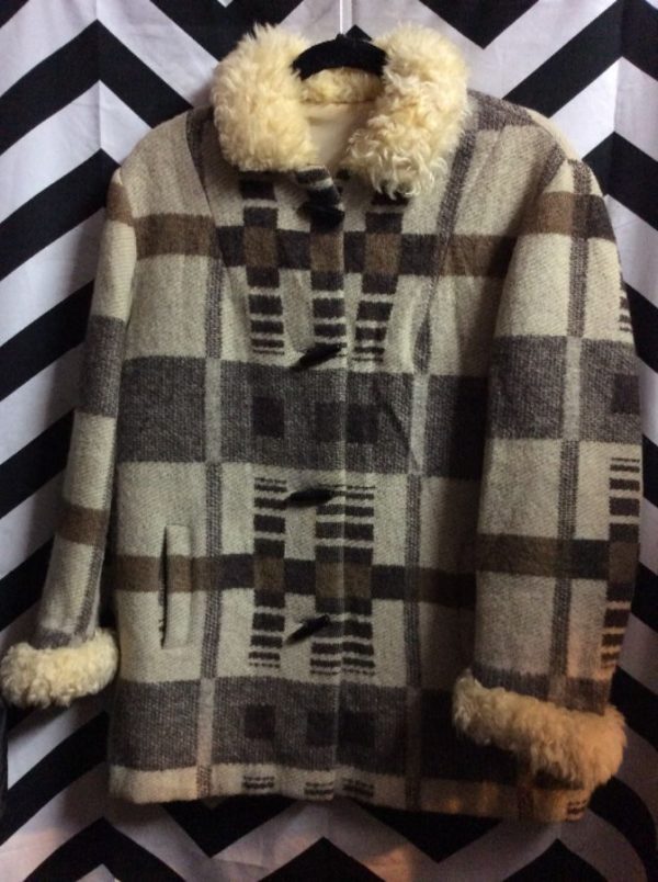 LONG JACKET, WOOL, BUTTON-UP WITH WOODEN BUTTONS, SATIN LINING, SHERPA TRIM COLLAR & CUFFS, SQUARE PATTERN, OFF WHITE/GRAY/BROWN, SIZE L