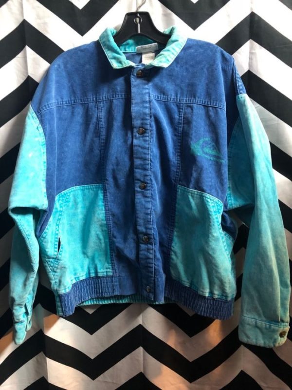 Quicksilver jacket, button-up, corduroy, 2 toned, chest logo, color block design, front pockets, blue/aqua, size M