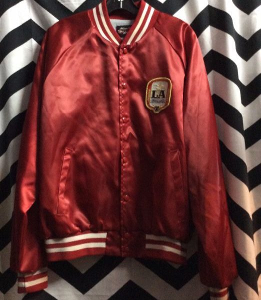 Baseball style jacket, button-up, satin, LA Anheuser-Busch, front logo patch, screen printed back print design, red/white, size XL
