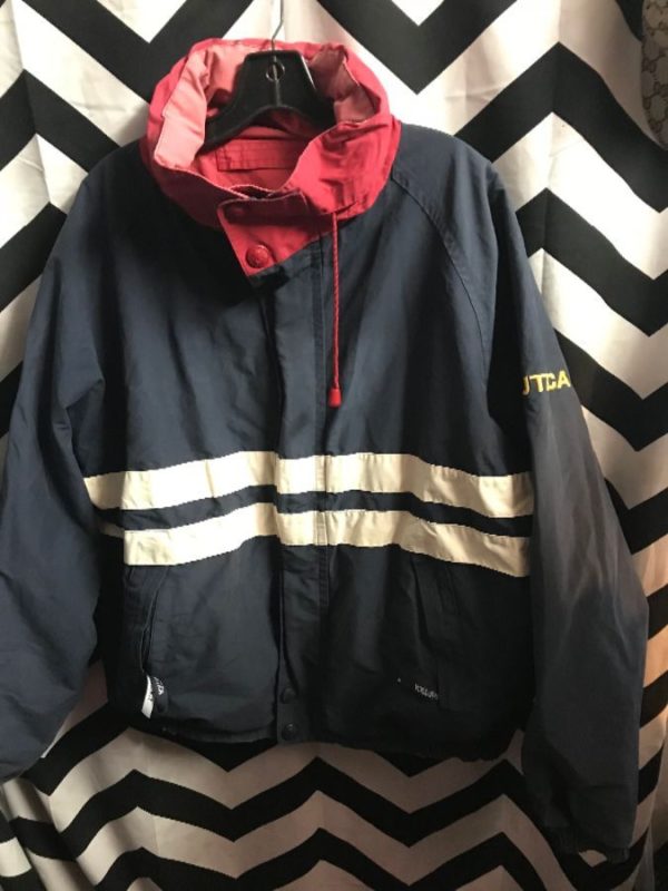 Nautica sports jacket, zip-up, roll-out hoodie, reversible, horizontal stripe design, red/navy/white, size XL as is