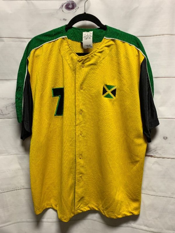 Casual Gear baseball jersey, short sleeves, button-up, athletic mesh, embroidered left chest design, stripes across shoulders and down sleeves, color-block design, appliqued & embroidered Jamaica #7, yellow/green/black/white, size XXL