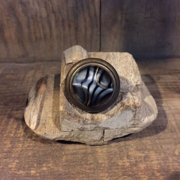 1960’S VINTAGE CONFECTION JEWELS RING, COCKTAIL RING, JELLY STRIPE PATTERN GLASS BUTTON IN BRASS METAL MOUNTING, GRAY/BLACK/BRASS, SIZE 6. OVERSIZED