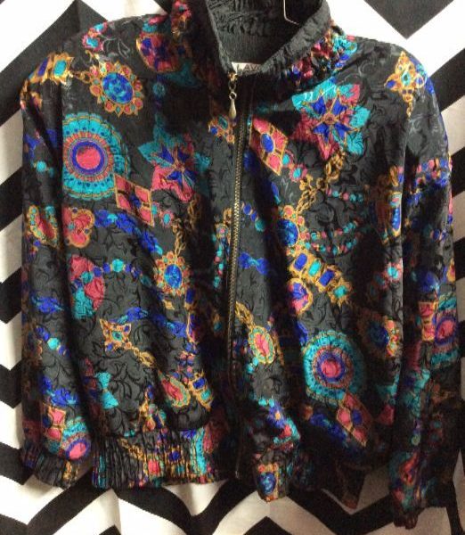 Windbreaker jacket, zip-up, jewel & chain pattern fabric, black/teal/purple, size M