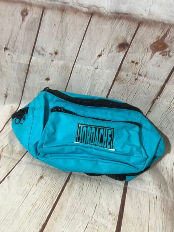 Jordache fanny pack, Jorache logo patch, multiple zip-up compartments, blue/black