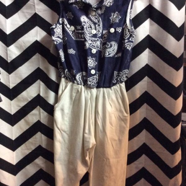 Jumpsuit, sleeveless, cotton, button-up, bandana print top with collar, solid color pants, blue/white, size 12