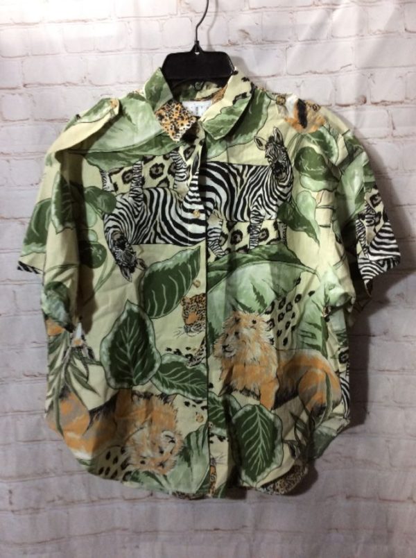 You Babes Hawaiian shirt, cotton, short sleeves, button-up, jungle animal print, green/creme/white/black/tan, size S