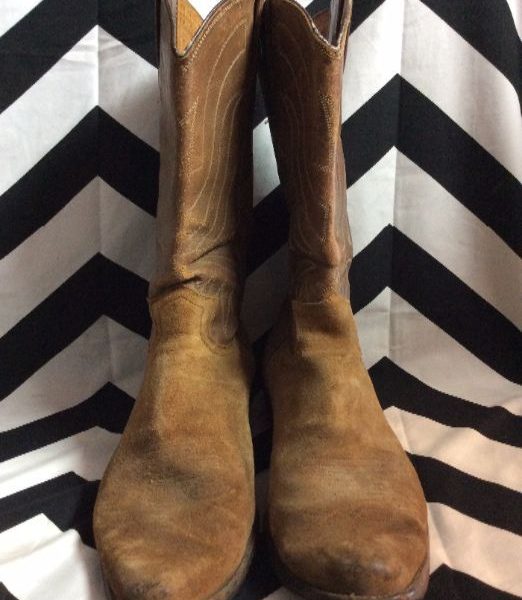 Justin cowboy boots, finished leather tops, suede bottoms, tan/brown, size 10.5 as is worn out soles