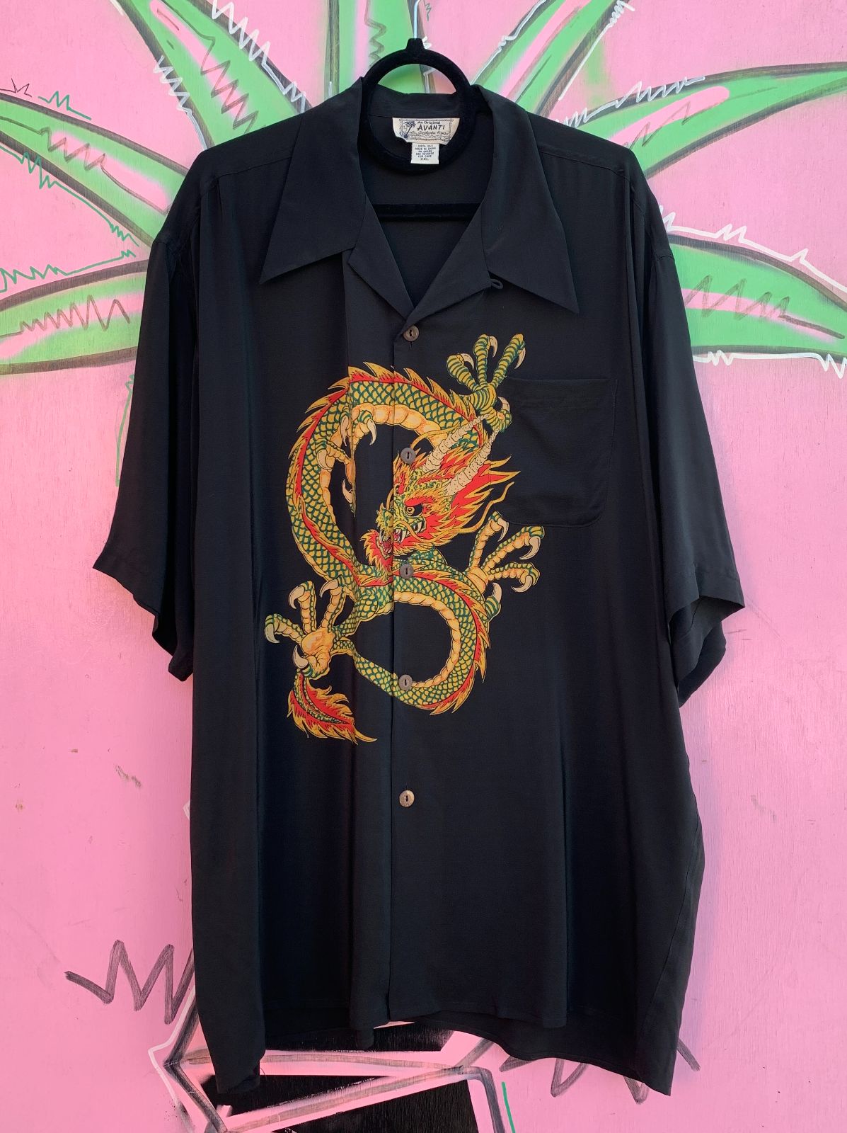 KILLER! 100% SILK FULL FRONT DRAGON PRINT HAWAIIAN SHIRT, COCONUT BUTTONS