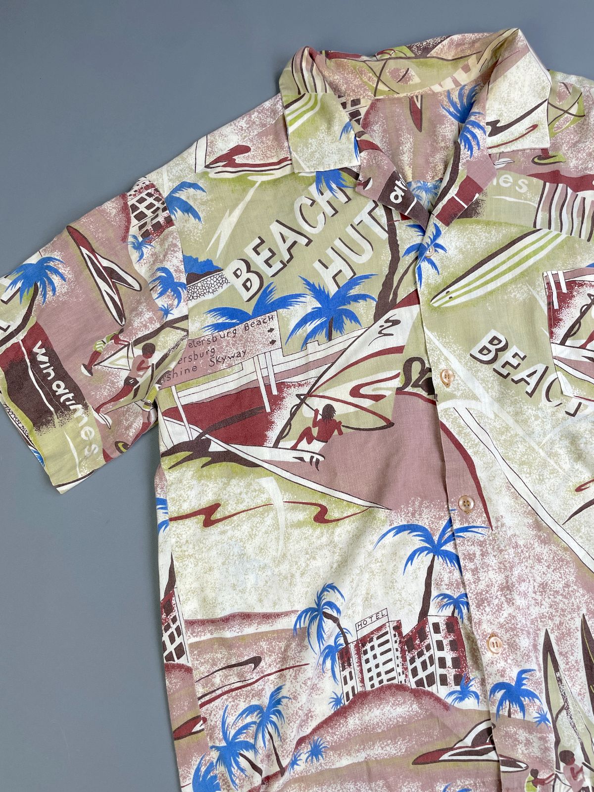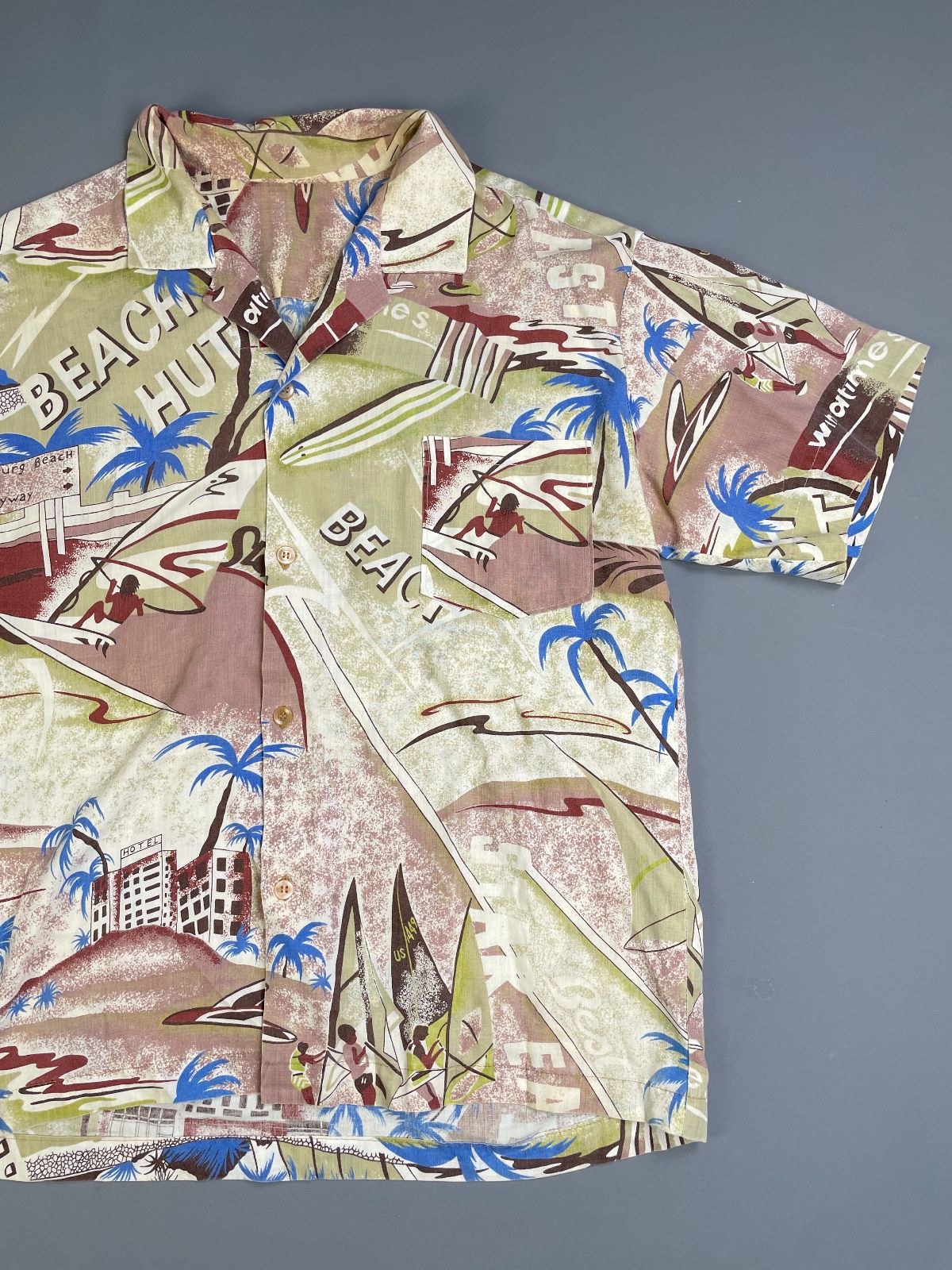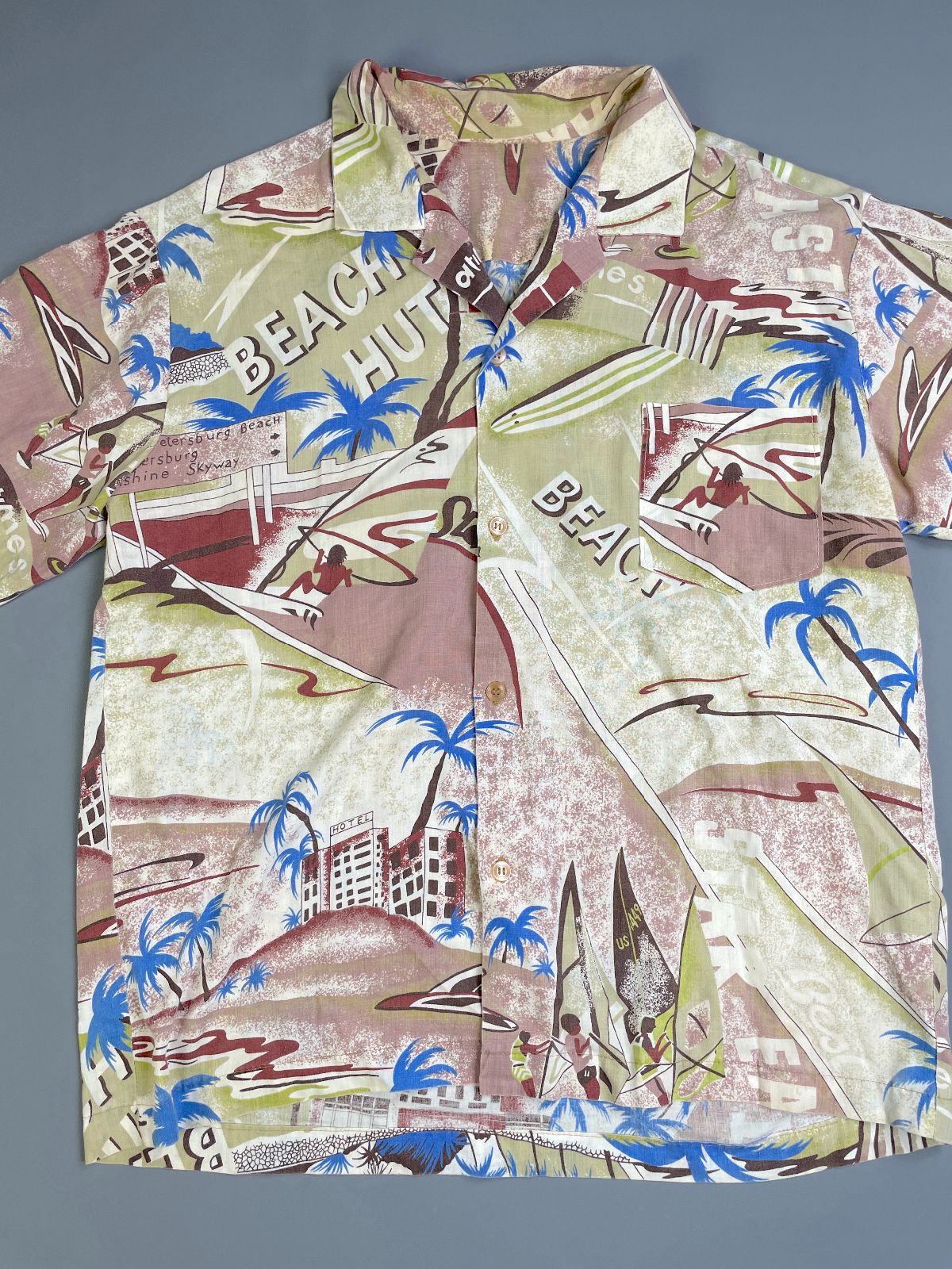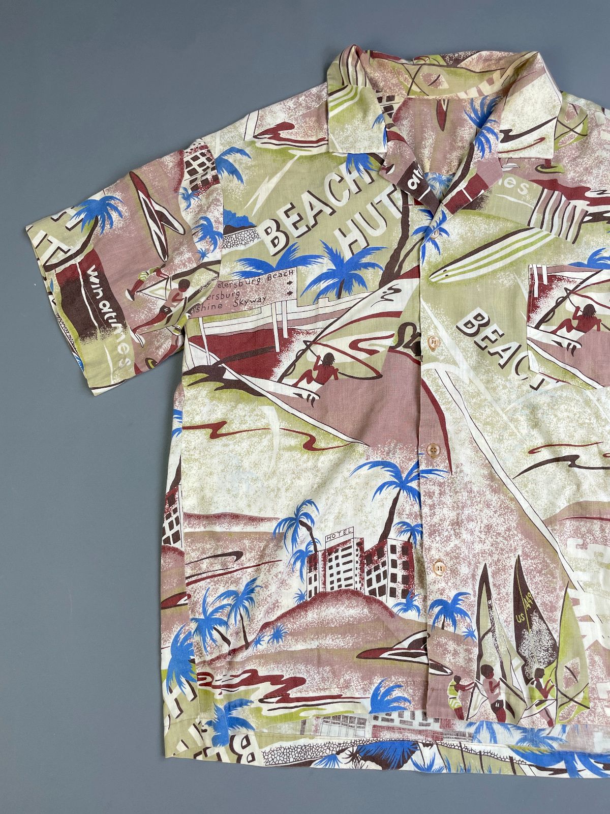 KILLER! 1970S-80S ALL OVER SURF BEACH HUT PRINT SHORT SLEEVE BUTTON DOWN SHIRT
