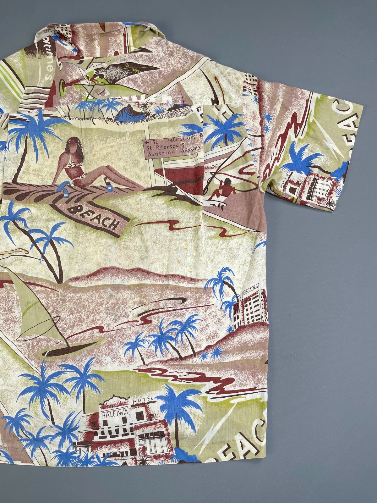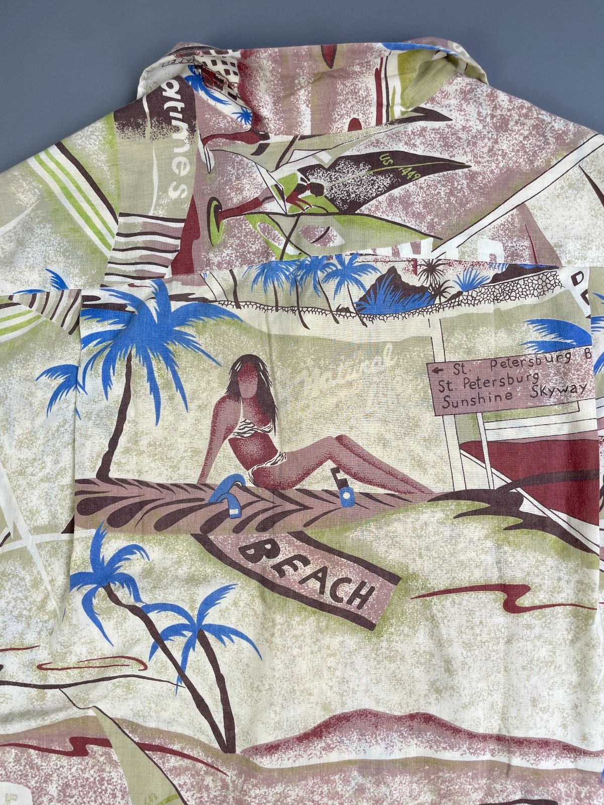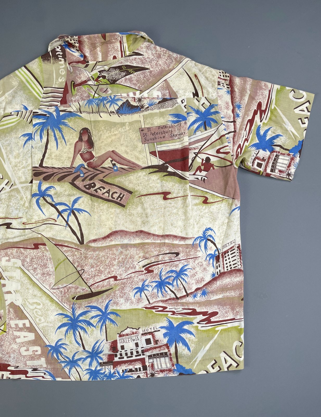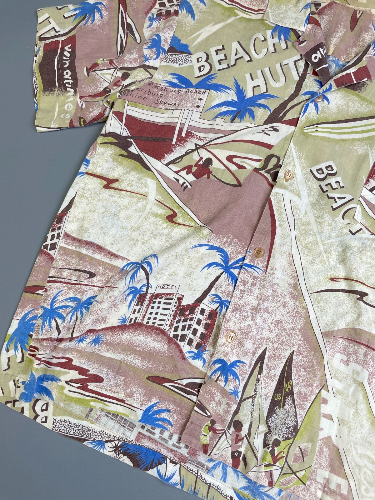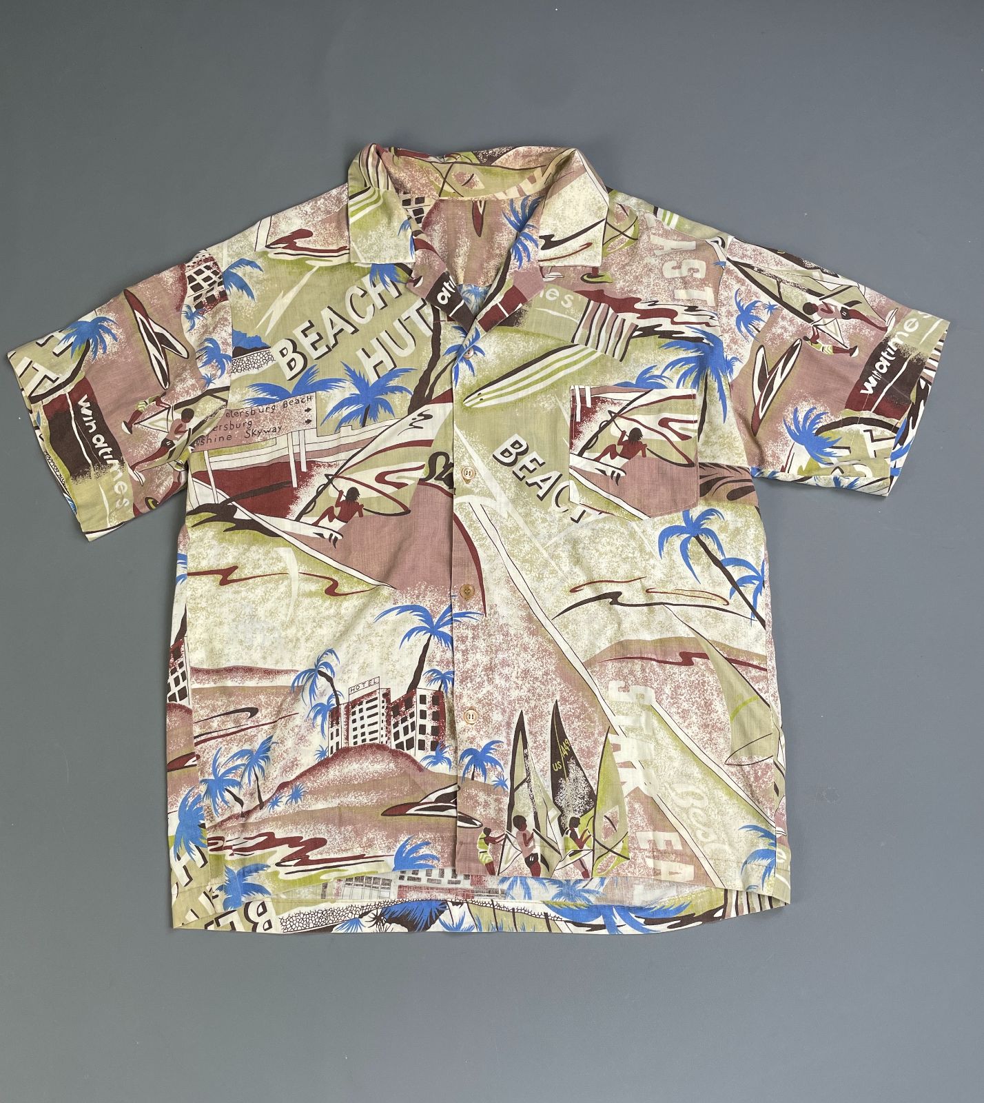 KILLER! 1970S-80S ALL OVER SURF BEACH HUT PRINT SHORT SLEEVE BUTTON DOWN SHIRT
