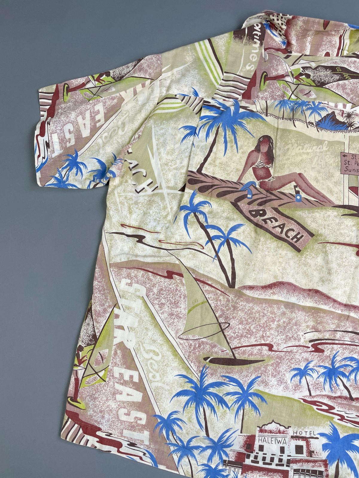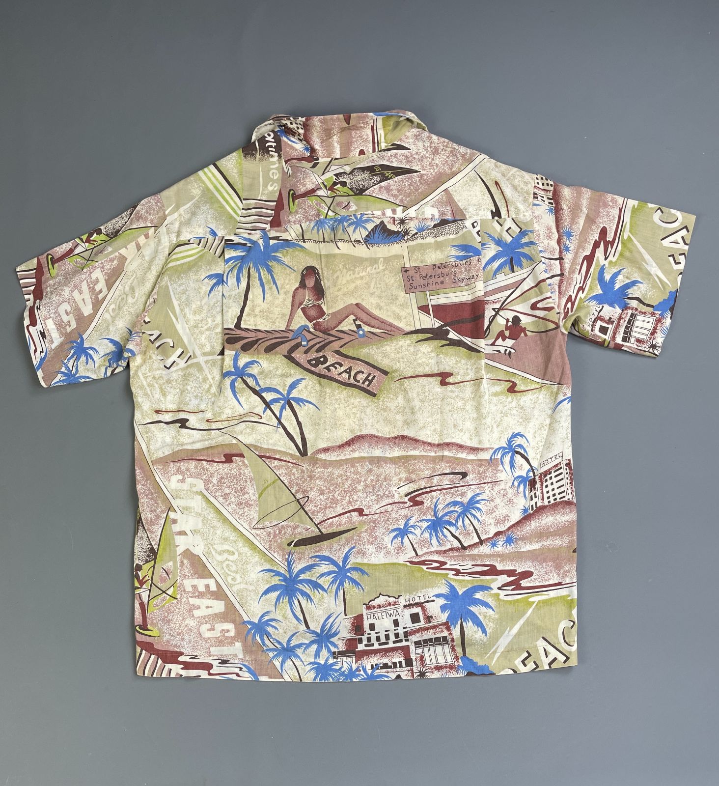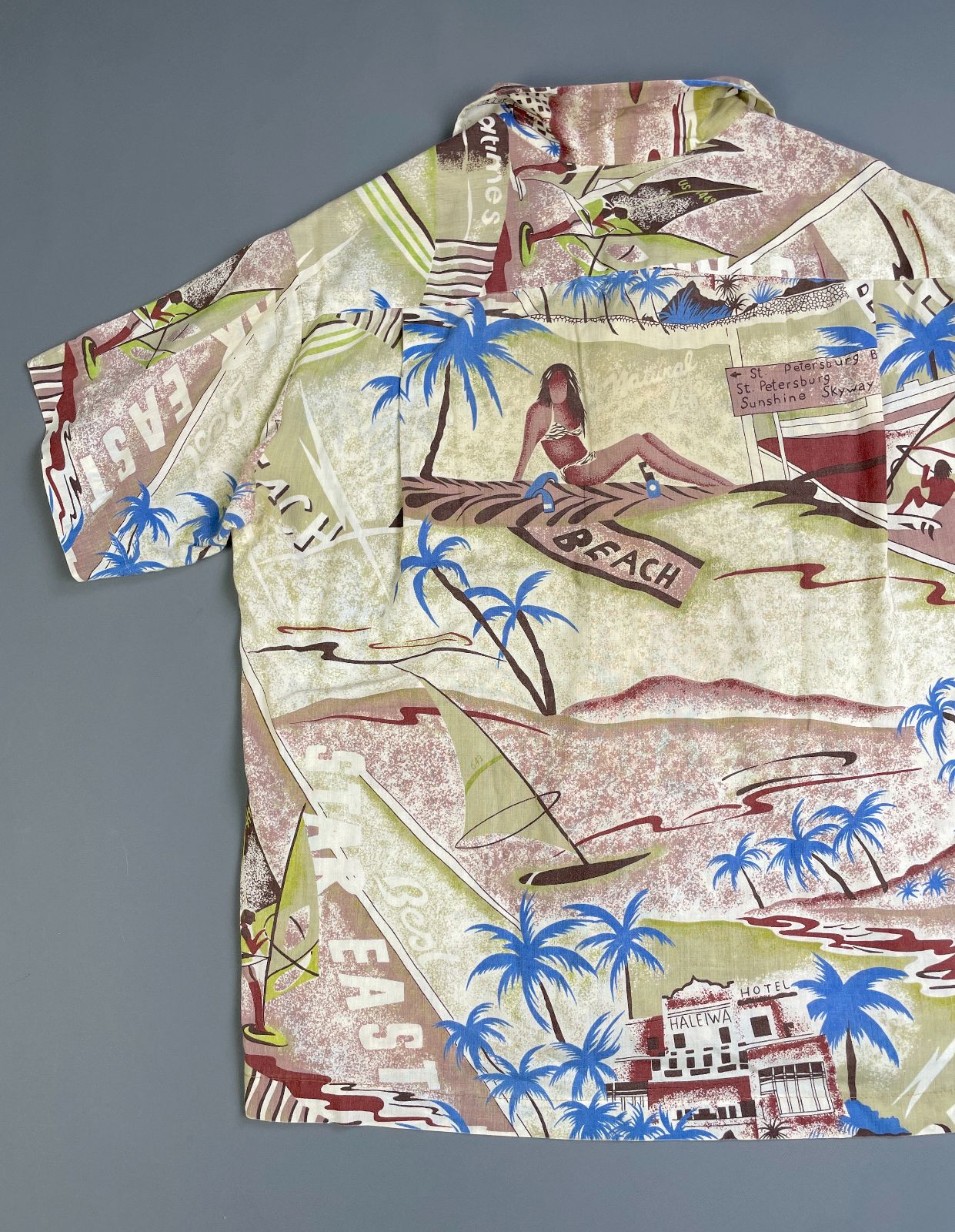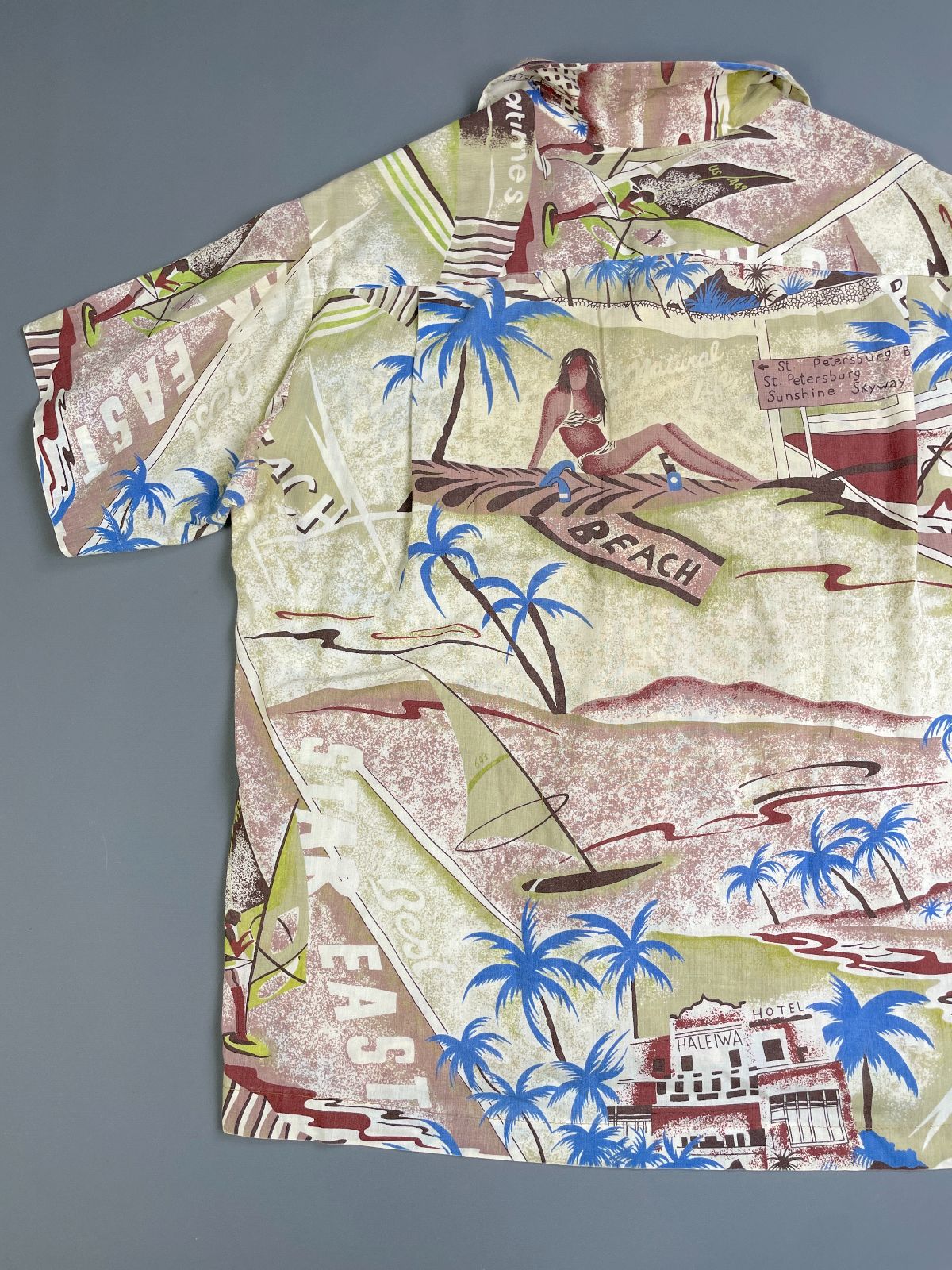 KILLER! 1970S-80S ALL OVER SURF BEACH HUT PRINT SHORT SLEEVE BUTTON DOWN SHIRT