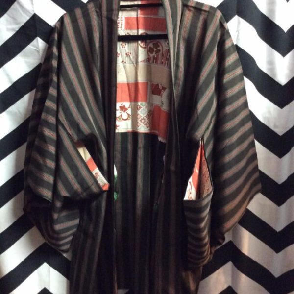 Kimono jacket, open front, vertical stripe pattern, pastel lining, brown/orange/gray, size one size fits all