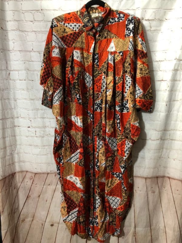 1990’s Sybra kimono, rayon, handmade, multiple funky patterns in patchwork style print design, black/white/orange/tan, size XL