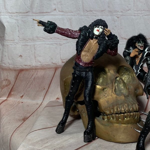 Figurine, Kiss, standing rock-star, Paul Stanley, full make-up with leather costume & platform heels, black/tan/white 7″H