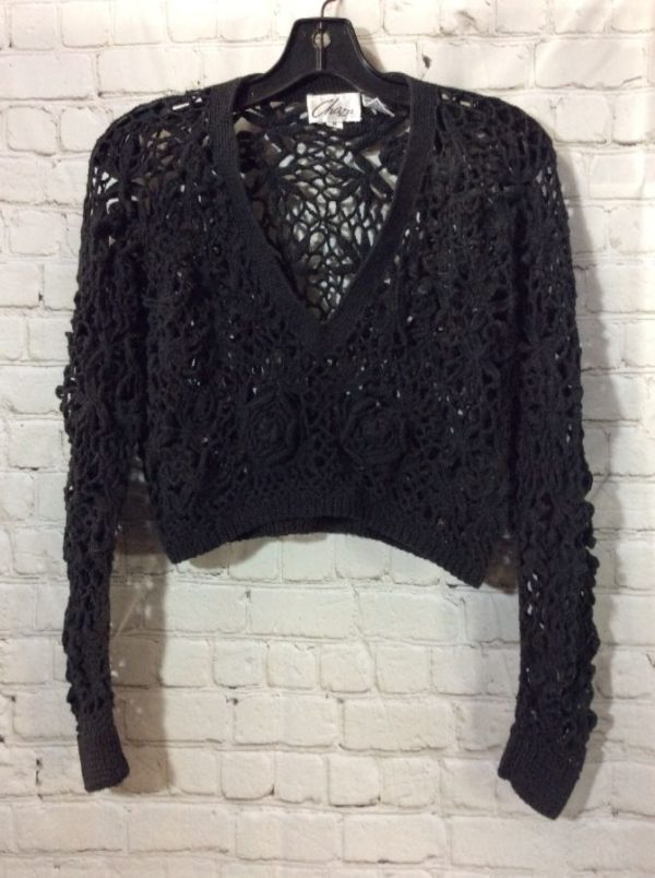 Chazz pullover sweater, crochet, v-neck, loosely woven, floral pattern, black, size M