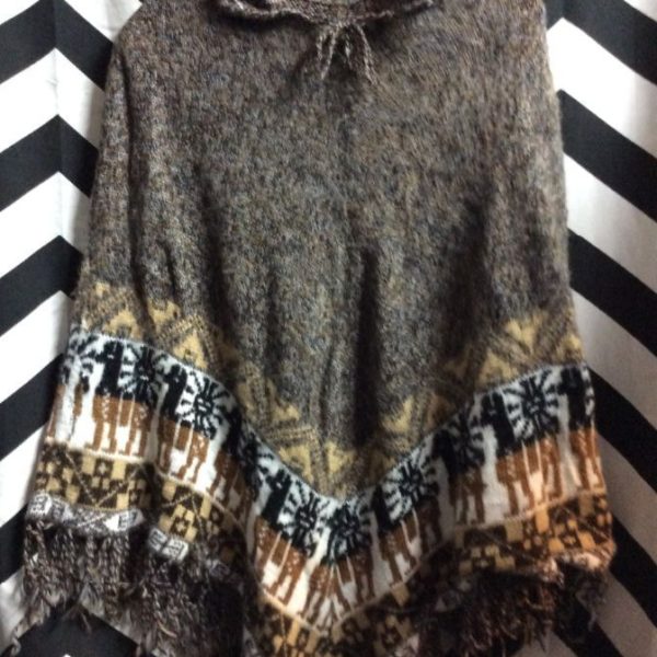 Poncho, wool knit, Llama & Sun print along bottom, super soft, fringe, brown/gray/taupe, size M