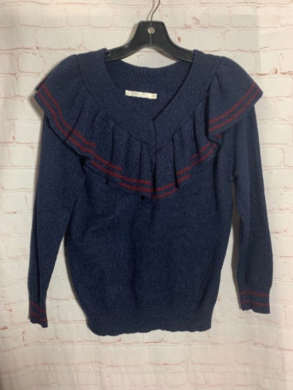 Cherry sweater, knit, pullover, ruffled design attached to v-neck, striped trim around ruffle & on cuffs, navy blue/burgundy, size T2