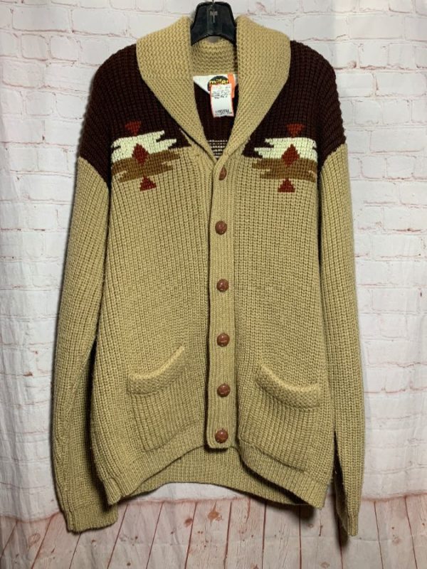 AS-IS NEPAL HEAVILY DISTRESSED THICK WOOL KNIT COWICHAN SWEATER W/ GEOMETRIC EAGLE DESIGNS