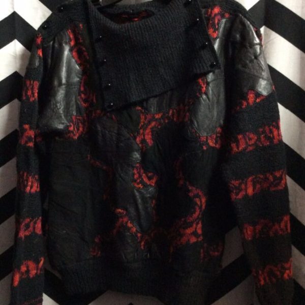KNITTED W/BUTTON-UP SHOULDERS & LEATHER PATCHWORK SWEATER