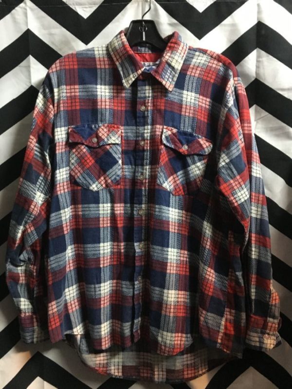 Lumber Jack flannel shirt, long sleeve, button-up, soft, plaid design, 2 front pockets, navy/red/white, size L