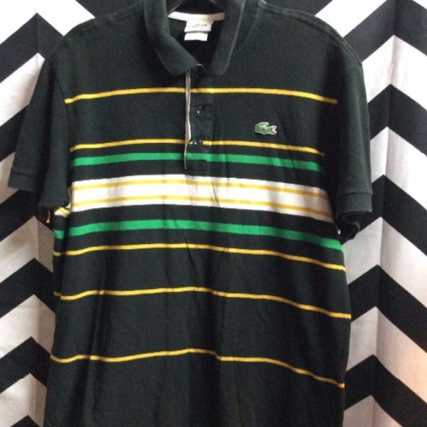 La Coste shirt, polo style, short sleeves, button-up neck, gator logo, horizontal striped design, black/yellow/green/white, size M