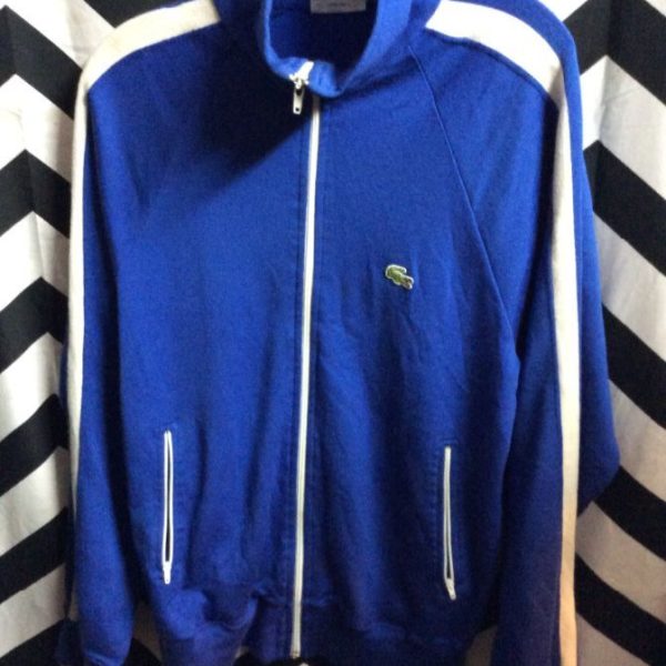 LaCoste sweatshirt, zip-up, stripes across shoulders & down arms, color-block design, blue/green/white, size M