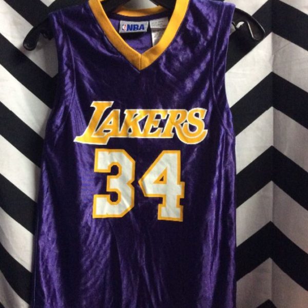NBA basketball jersey, Lakers, #34 O’Neil, contrasting neck trim, screen printed lettering & numbers, purple/white/yellow, size S – boys